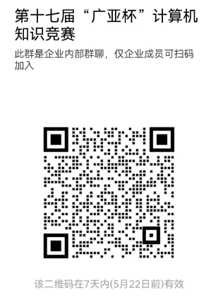 报名参赛员工企业微信扫描下面二维码,加入第十七届“广亚杯”计算机知识竞赛企业微信群,并群内填写报名表。(竞赛具体事宜,后续将在此群通知!)