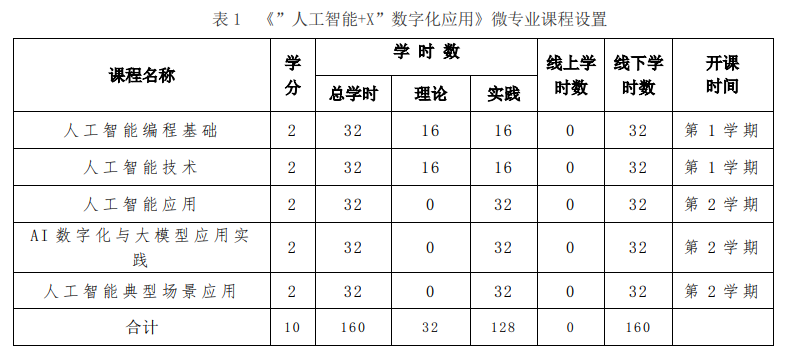 《”人工智能+X”数字化应用》微专业教学时间为2个学期,课程设置如下表。