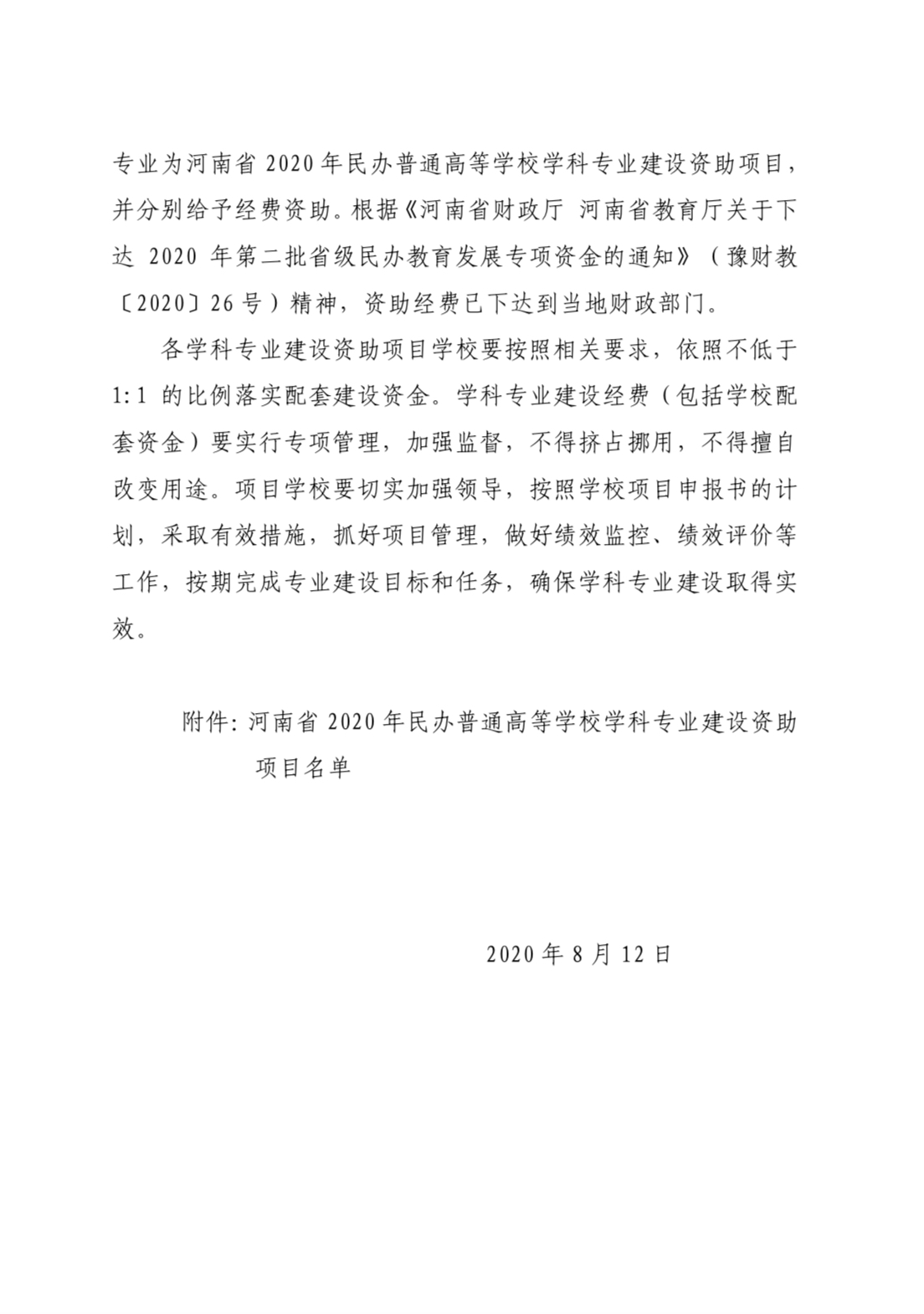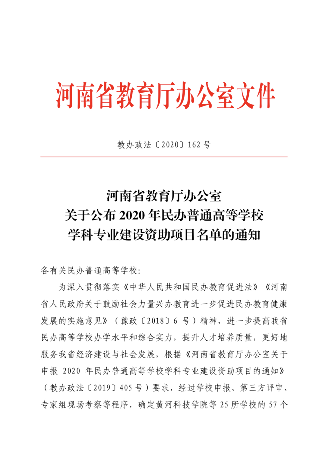 河南省教育厅办公室关于公布2020年民办普通高等公司学科专业建设资助项目名单的通知