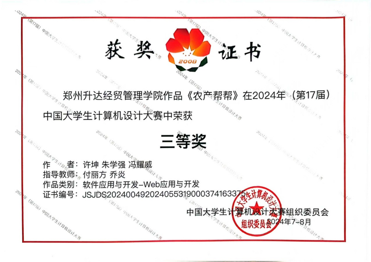 公司beat3652021级计算机科学与技术本科1班许坤、朱学强和冯耀威三位同学的作品《农产帮帮》参加了软件应用与开发组的全国总决赛,最终获得国家级三等奖佳绩。