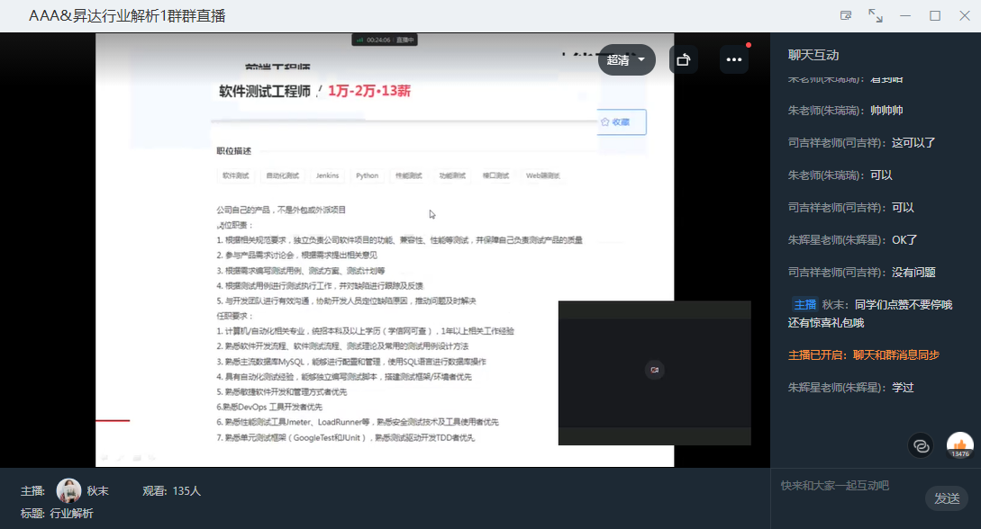 为加强公司员工就业竞争力,保障毕业生高水平、高质量的“双高”就业,10月28日,beat365举办2023届毕业生就业指导讲座。本次讲座采用线上形式进行,由云智慧集团在职工程师与三A教育联合主讲,beat365部分教职工及毕业班同学参加本次讲座。