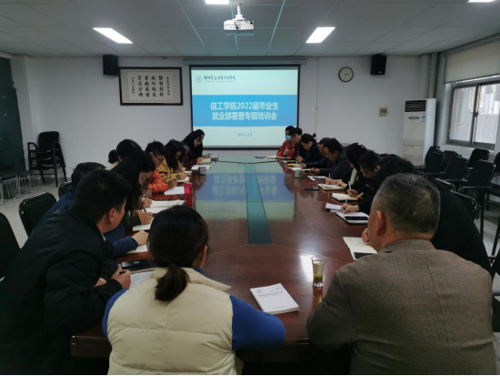为推动2022届毕业生就业工作有序展开,帮助员工树立正确的就业观,公司于12月8日下午三点在资讯楼104召开2022届就业工作部署暨专题培训会。信工公司经理白鑫、党委书记张现水、行政秘书王崇及全体辅导参与此次会议,会议由王崇老师主持。