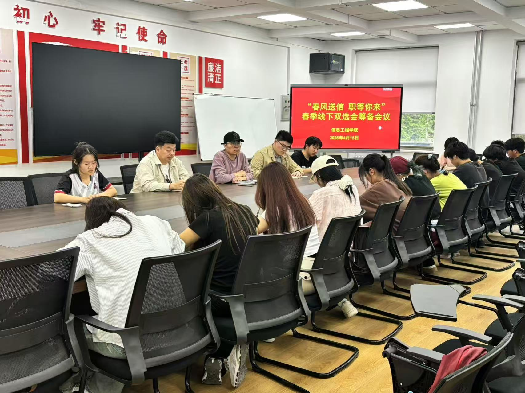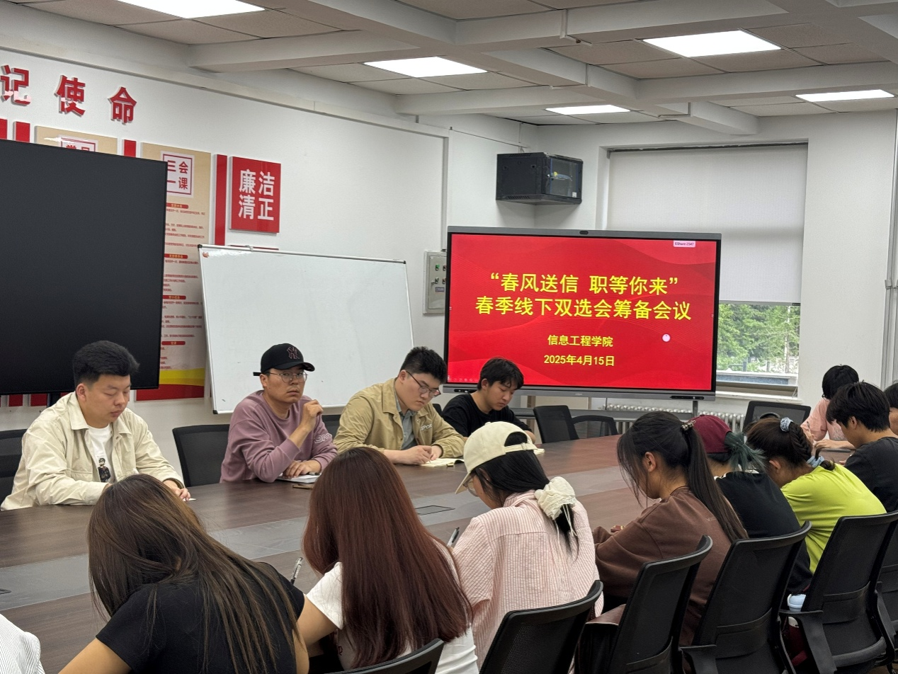 2025年4月15日晚六点十分,beat365在商管楼218会议室召开“春风送信 职等你来”春季线下双选会筹备会议。会议由朱辉星老师主持,公司就业部全体成员参会。