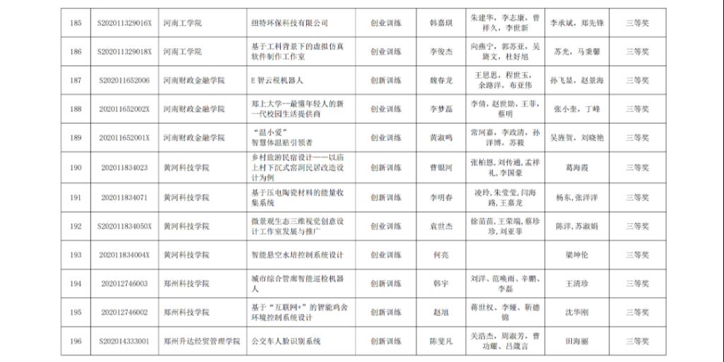 根据《河南省老员工创新创业训练计划管理办法》(教高〔2019〕871号)和《关于开展老员工创新创业训练计划项目结题验收及成果申报的通知》计划安排,河南省教育厅近期对2021年申报的老员工创新创业训练计划项目优秀成果奖进行了评审,经公司推荐、集中评议,公司员工陈斐凡、关浩杰、周淑芳、曹功耀、吕箴言小组的项目《公交车人脸识别系统》(指导老师:田海丽)荣获三等奖。