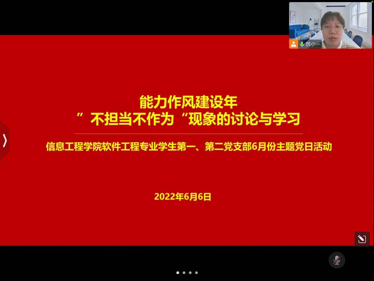 6月6日晚上,信工公司软件工程专业员工第一和第二党支部开展线上以“能力作风建设年‘不担当不作为’现象的讨论与学习”为主题的党日活动,支部全体党员参加了此次会议。