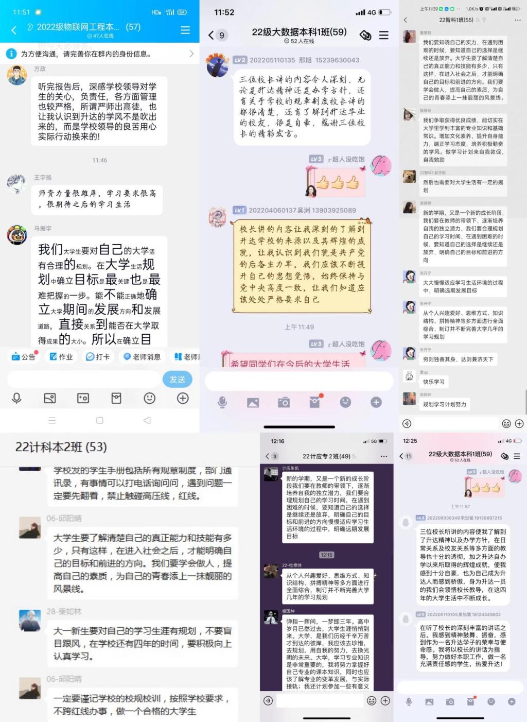 上午各位领导的精彩分享对帮助新生更快地适应大学学习、生活,并确定奋斗目标,有效引导新生牢固树立时代意识,领悟升达精神,担当家国责任,并助力新生开启求知问学新征程有着重要意义。经过一上午的学习,信工公司2022级新生感触颇深,纷纷在班级群中展开热烈的讨论,同学们表示要为己拼搏,为校争光,以全新的精神状态开启人生新征程。