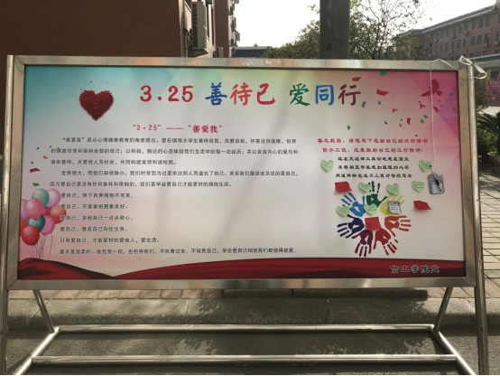 3月25日,谐音“善爱我”,公司于3月25日-3月31日开展“3.25善爱我”老员工心理健康教育系列活动,鼓励老员工从关爱自我身心健康做起,以阳光心态面对学习与生活,营造健康向上、和谐奋进的育人氛围。