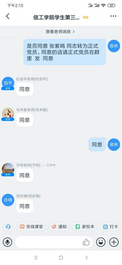 2020年5月29日下午1:00,信工公司第三党支部通过钉钉召开了预备党员转正大会,讨论关于王梦梦等9名同志的转正问题;会议由宣传委员宁珂老师主持,正式党员和预备党员共24名同志参加了会议。
