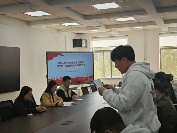 2024年11月21日,beat365电子信息工程专业员工第一党支部在商管楼218会议室召开了预备党员转正大会,讨论关于预备党员李一凡同志的转正事宜,会议由电子信息工程专业员工第一党支部支部书记杜自平主持,全体党员参加了会议。