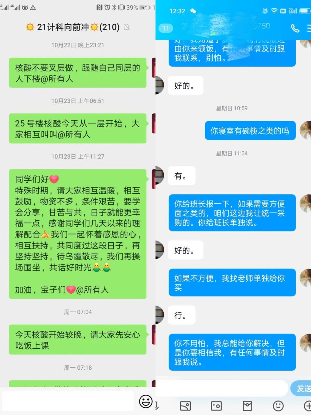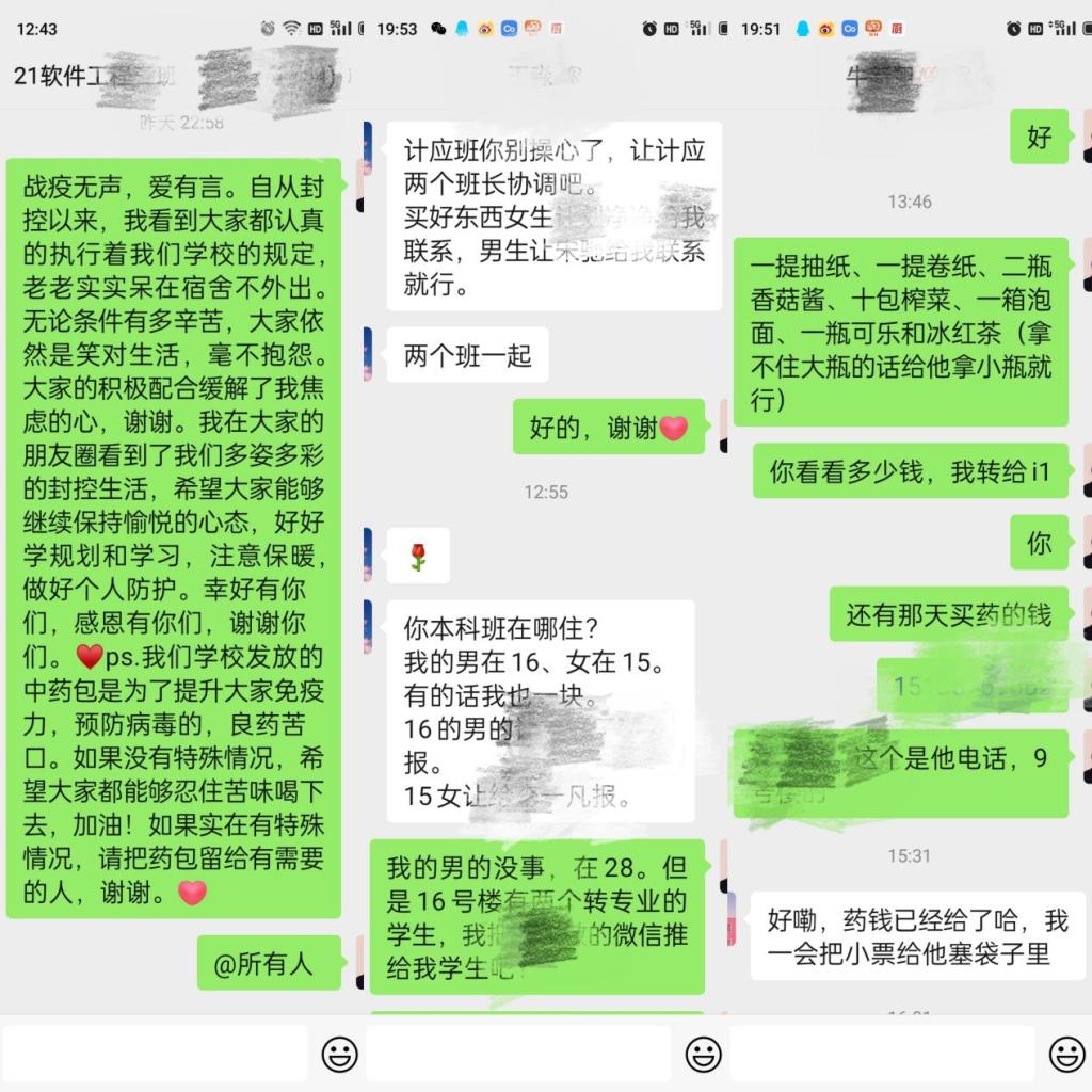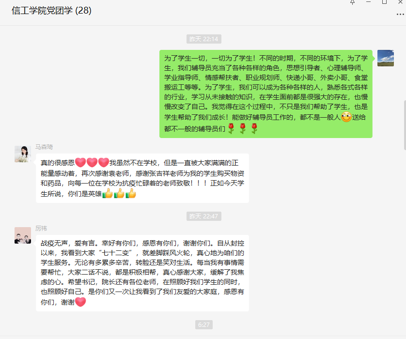 信工辅导员崔晓宁寸步不离守在生病员工身边,直至员工亲属赶到医院接续陪护,方才返校。王建红化身邻家大哥哥,不厌其烦与200多名新生分享着防疫近况。马森琦和厉祎因封控在家,但依然24小时在线,每天汇总、上报员工信息,统计员工需求,反复确认有无遗漏信息,耐心回复同学们的消息,时刻关注同学们的身心健康,提醒他们天冷加衣,照顾好自己。在同事们的帮助下,两位老师员工所需的物资也按时保量的到达了员工的手边。