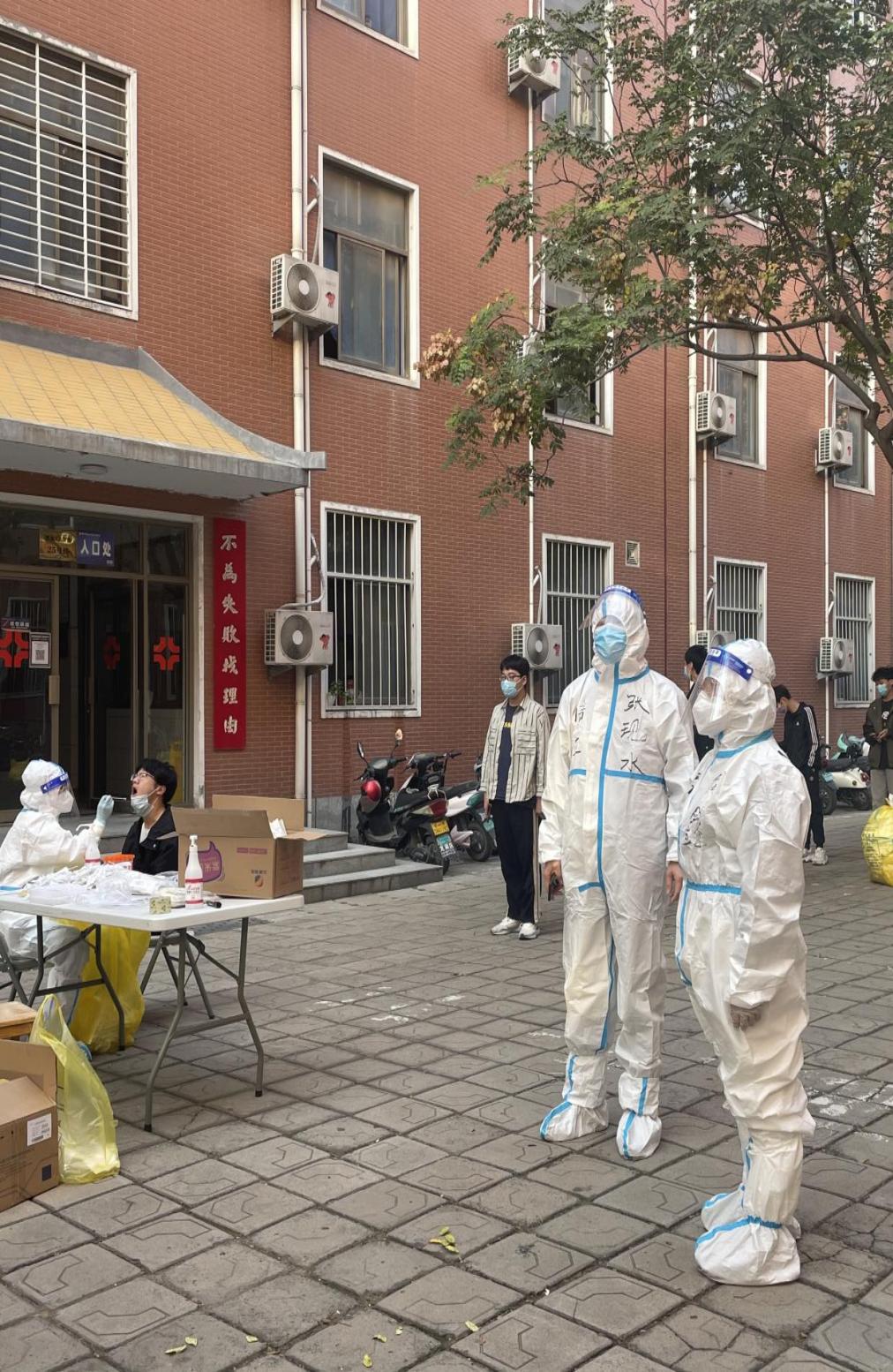 “同学们,下来做核酸了。”信工辅导员杜自平已经重复了上千次。在各宿舍楼栋,辅导员们参与了每一次核酸检测,坚定的守护在核酸检测点。头天晚上9点,各小组组长去健康中心领取员工核酸检测物资,逐一清点,搬运。第二天早上,一切准备就绪,穿上密不透风的防护服,戴好口罩和防护帽,不喝一口水,不进一口食,不断地扫码录入、贴条形码、准备采样管、叮嘱大家注意间隔……当工作忙完,还要清点核酸检测人数,看是否有遗漏,做好核酸检测员。