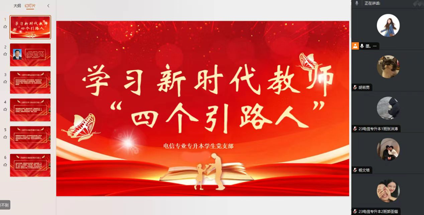 进一步强化党员教师的责任感和使命感,2024年9月9日信工公司电信专业专升本员工党支部开展了争做“四有好老师”,当好“四个引路人”主题党日活动。会议由党支部书记杨亚丽主持,全体党员在线上参加了学习活动。