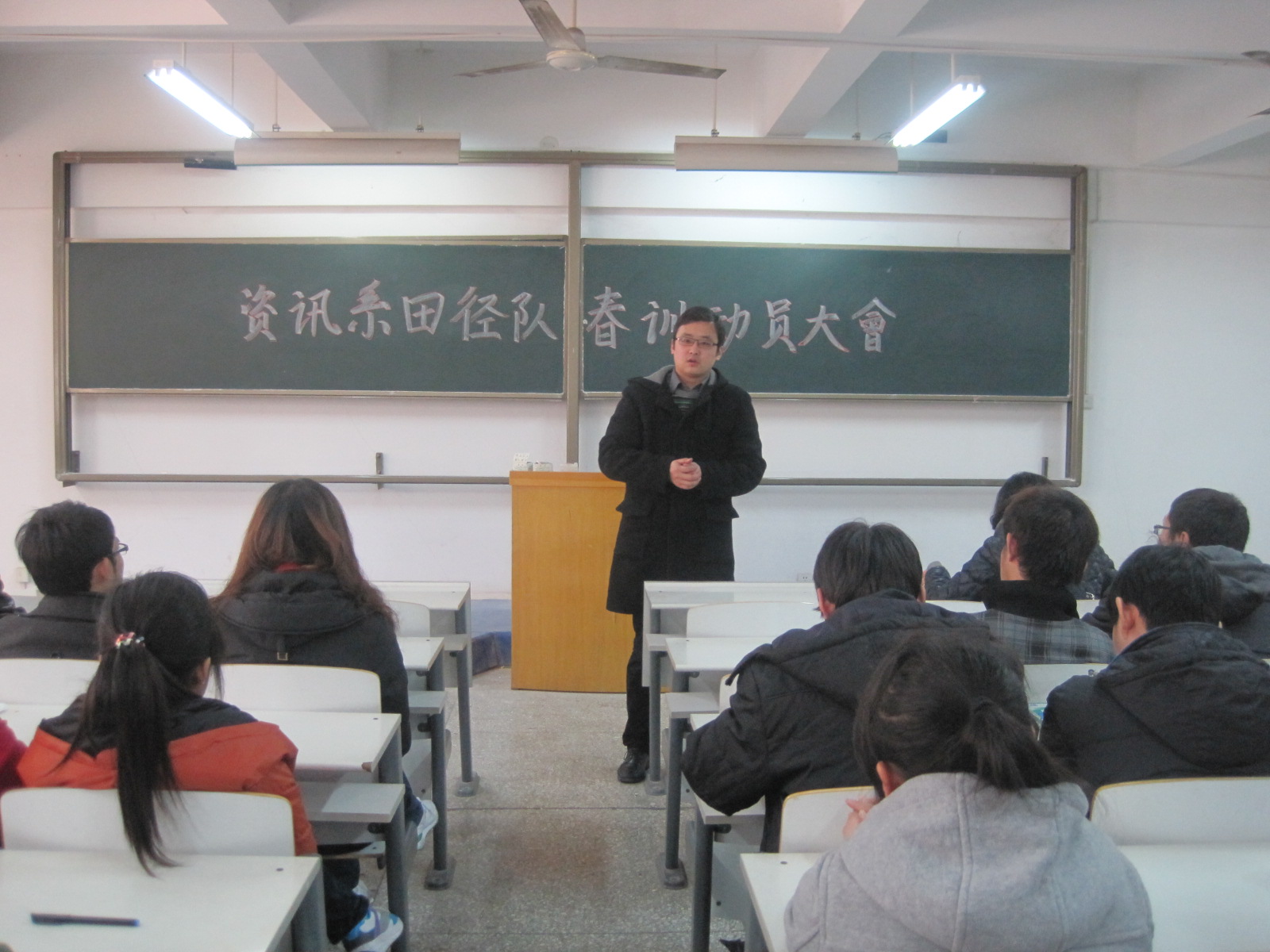 最后,田径队队长刘长江学长从个人经历和体验讲起,将训练心得传达给同学们,希望同学们坚持到底,不轻言放弃;同时,他就春训期间的训练计划和要求及注意事项一一作了详细安排。