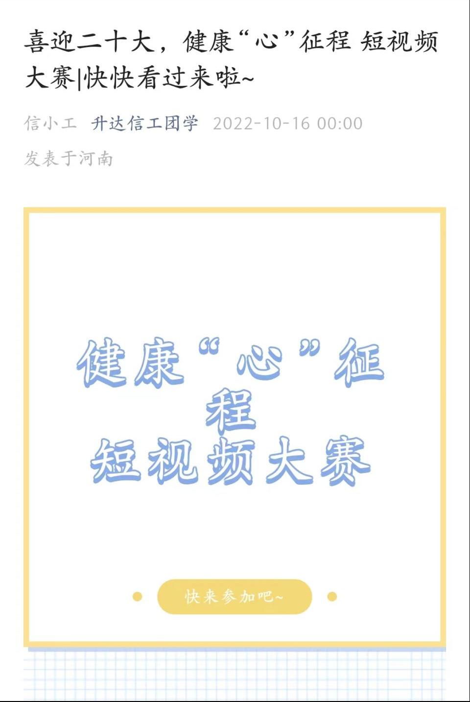 奋进新征程,建功新时代。为迎接中国共产党第二十次全国代表大会,深入学习贯彻习近平新时代中国特色社会主义思想,持续落实全国全省高校思想政治工作会议精神,切实加强和改革新时代高校师生心理健康教育工作,公司于10月17日至21日举办“喜迎二十大,健康‘心’征程”短视频大赛。
