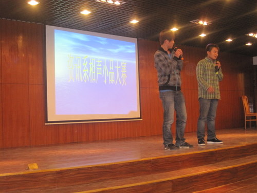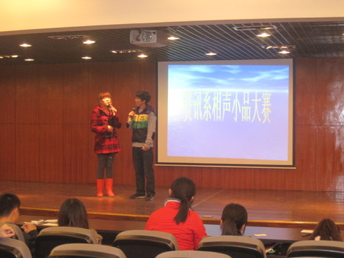 经过评选,11信管软工班的相声《老员工活》和11电信1班的小品《落叶归根》将代表我系参加11月30日的资讯、文法、国贸、企管四系联合相声小品大赛。