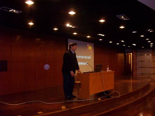 首先,程教授为大家宣讲了全国老员工电子竞赛的概况。接着,为同学们阐述了参加电子设计大赛应注意的事项:如大赛前一周买好实验器材;根据给出的实验器材猜想大赛的题目;假期也着手准备,组员之间相互探讨,每个组员发挥自己的特长,利用自己的特长在大赛前就把作品做出来;平时做出的作品注重调试,三分设计,七分调试等等。程教授还语重心长的强调:利用平时的时间做出自己的电子作品,提高动手能力,将来就业的时候必将很受欢迎,就业前景也很好。程教授的精彩报告博得了大家的阵阵掌声。