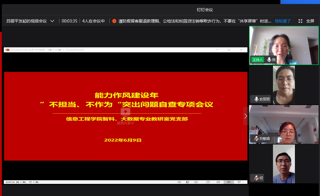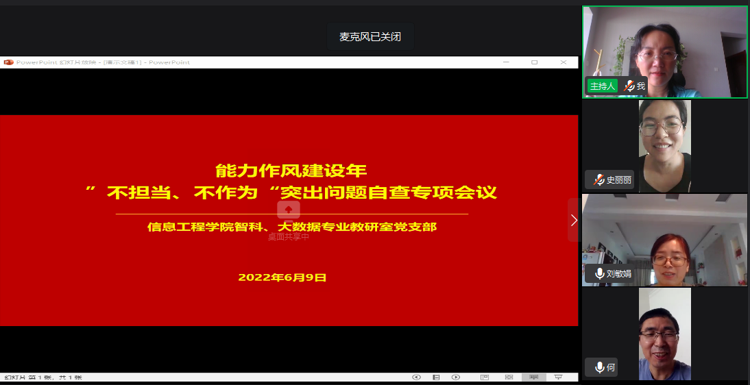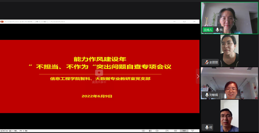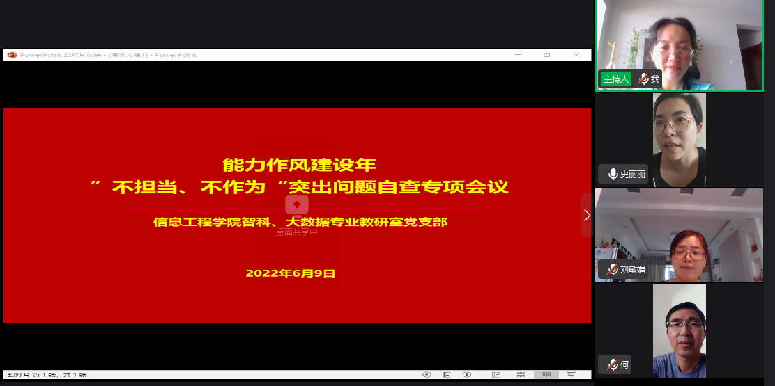 2022年6月9日,为深入学习贯彻落实省第十一次党代会和十一届省纪委二次全会要求和公司“能力作风建设年”系列会议精神,聚焦作风建设主题,加大对“不担当、不作为”突出问题的督促力度,信工公司智科、大数据专业教研室党支部召开了“不担当、不作为“自查专项会议,会议由党支部书记吕丽平主持,全体正式党员和预备党员参加。