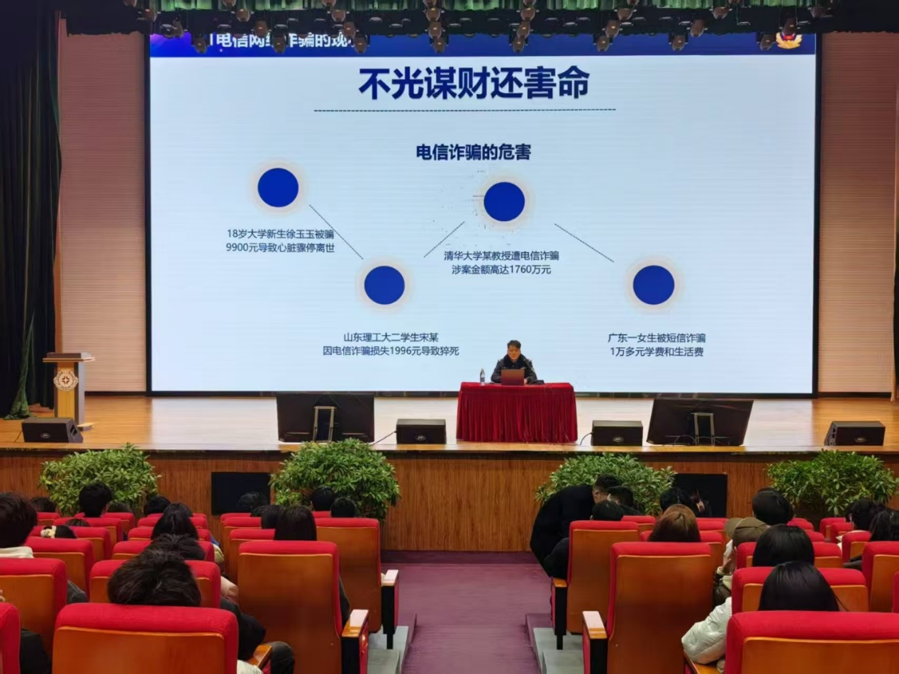 活动伊始,吴文渊警官围绕“电信诈骗的概念、起源与发展”展开讲解,让师生们对电信诈骗有了清晰的认识。他提到,随着通信和互联网技术的不断发展,电信诈骗手段也日益翻新,给人们的财产安全带来了极大威胁。