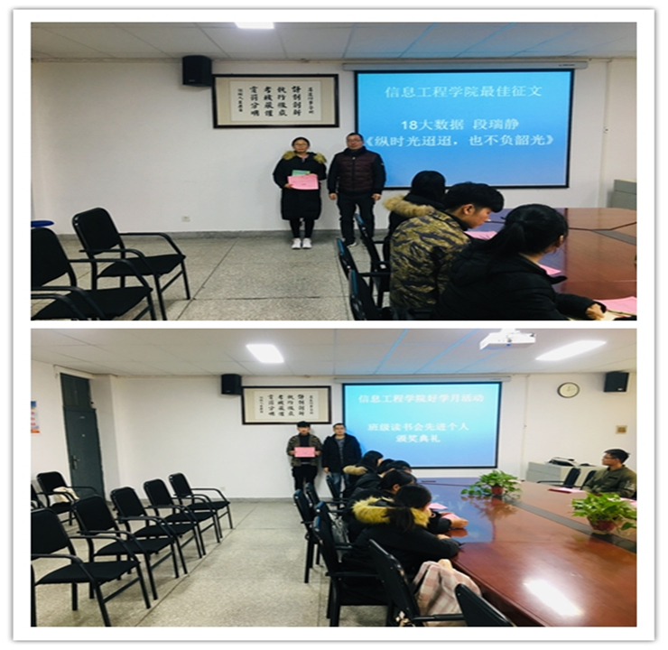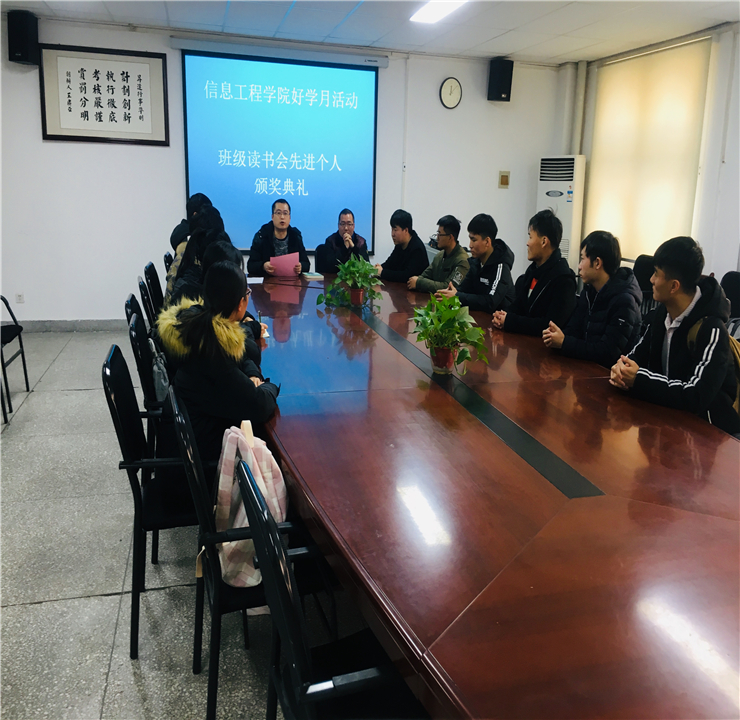 腹有诗书气自华,读书万卷始通神。为共建升达优良学风,促进公司学风建设,增强全院员工学习的积极性和主动性。12月26日中午12点,信工公司于资讯楼104会议室举行“好学月”活动之班级读书会先进个人颁奖仪式。团委常务副书记袁奉亚老师、18级辅导员王建红老师、团委副书记左金磊、员工会副主席常向凯和学术部部长楚金虎出席了本次仪式。
