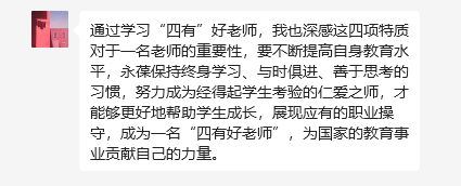 首先,支部全体成员在会前认真观看了优秀教师、师德师风典型案例的视频,学习其精神;会上,根据前期的学习,支部教工党员结合自身的工作实际,围绕“四有”好老师展开了讨论交流,与会教师共同分享了自己的感悟,表示身为一名老师,将继续加强学习,不断提高个人修养,把为员工服务放在第一位,努力成为经得起员工考验的“四有”好老师。