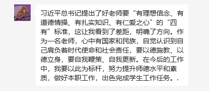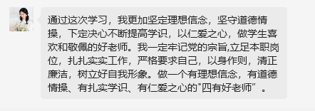 最后,支部书记马森琦做了总结发言,她鼓励教工党员要争做“有理想信念、有道德情操、有扎实学识、有仁爱之心”的“四有”好老师,并强调,师德师风建设是一项长期而艰巨的任务,需要不断努力,立德修身,真正将师德师风建设践行于员工工作中。