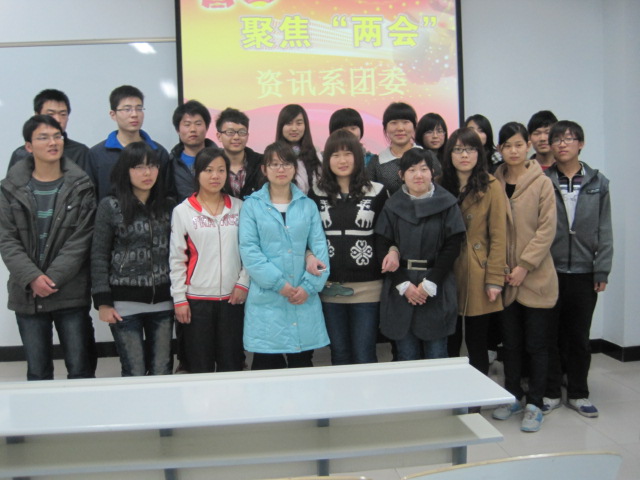 | 备受瞩目的“两会”已顺利结束,为了让员工及时关注时事政治,进一步提高同学们的政治素养和学习热情,资讯系团委精心组织团学干部集中观看“温家宝答中外记者问”视频。3月15日晚上6点30分,在资讯系行政秘书兼团委书记张娟老师的带领下,全体团委员工会干部在道镕楼111共同进行观看。