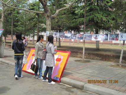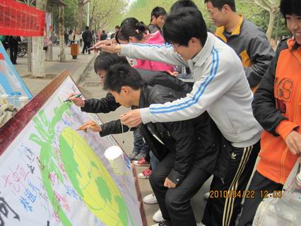 早上7点,我系员工会办公室的同学们就把精心挑选的宣传图片挂了出来,图片内容有的让人感到惋惜,有的触目惊心,有的则以漫画的形式在令人捧腹的同时又发人深省。中午放学后,办公室全体成员又穿着醒目的校服,热情为路过的同学介绍环保知识,同学们也争先恐后地在展板上签上了自己的名字,长长的队伍形成了一道亮丽的风景线。