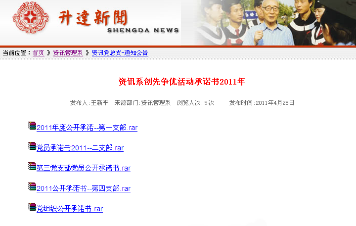 4月22日,党组织和党员个人承诺结束后,资讯系党总支及时在资讯楼大厅展板和系党总支网站上进行了全面的公示,营造全面“创先争优”的良好氛围,以便更好地接受师生的共同监督。承诺内容主要围绕加强服务型党组织建设,落实2010年公开承诺开展情况,加强党员队伍教育和管理,规范党务工作运行机制,加强党员与群众的密切联系,发挥党员在教学、科研、管理中的骨干作用等方面。