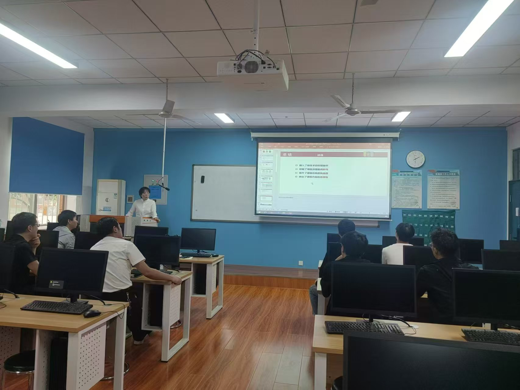 活动中,由公司督导吕丽平教授给出磨课的样例,以《数字电子技术》为例进行了说课和讲课;紧随其后,教研室4位新入职的教师进行了磨课,曾健老师对《计算机网络》进行了磨课,张起峰老师、常黎明老师、马浩申老师和宁跃飞老师对《区块链技术及其应用》进行了磨课,同头课老师同台交流,各自取长补短,大大优化了教学方法,提高了教学效果。