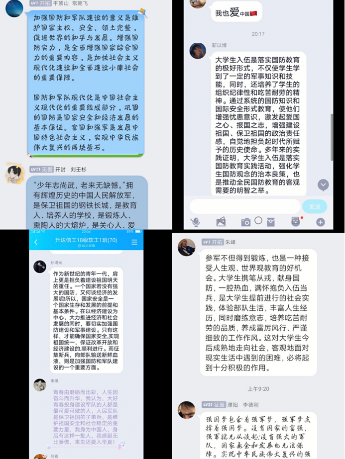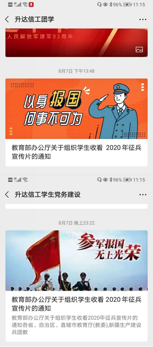 8月7日,公司分别在团学及党建微信公众号上发布微信推文——《教育部办公厅关于组织员工收看2020年征兵宣传片的通知》,引导员工按时收看。各班辅导员通过QQ、微信等网络平台开展线上参军入伍宣传动员,并积极开展线上讨论,针对同学们提出的相关疑问进行耐心解答。进一步鼓励动员广大适龄青年响应祖国召唤,踊跃报名参军,到军营建功立业。