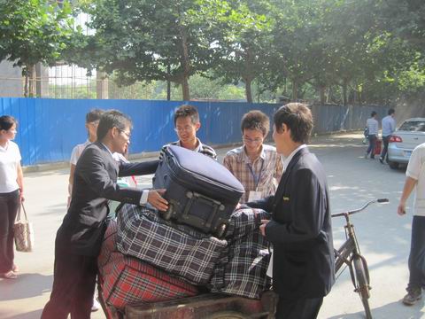 天气虽然依旧炎热,却也比不过大家迎接新生的热情。随着新生们一个个的陆续到来,迎新工作也开始有条不紊的展开,各工作点的老师和同学们个个精神饱满,服务周到。负责接待的同学热情的招呼着新同学和其家长,微笑着递过来板凳和茶水,并且耐心的引导新生办理入学的各项手续:领取报到程序单、缴费单,扫描通知书,办理注册手续及安排住宿,每个环节都细心的为新生讲解注意事项。负责帮新生运送行李的同学则将新生的行李物品用三轮车运送到相应的宿舍楼下,他们一趟接着一趟,汗流浃背,但是在他们的脸上始终保持着开心的笑容。宿舍楼前的接待点也同样是一派热火朝天的景象,团学干部们引导新生到楼管老师值班室办理入住手续,并帮助搬运行李。虽然楼层很高,行李物品很多、很重,但他们只是笑着擦擦汗,又投入下一轮紧张的工作中。