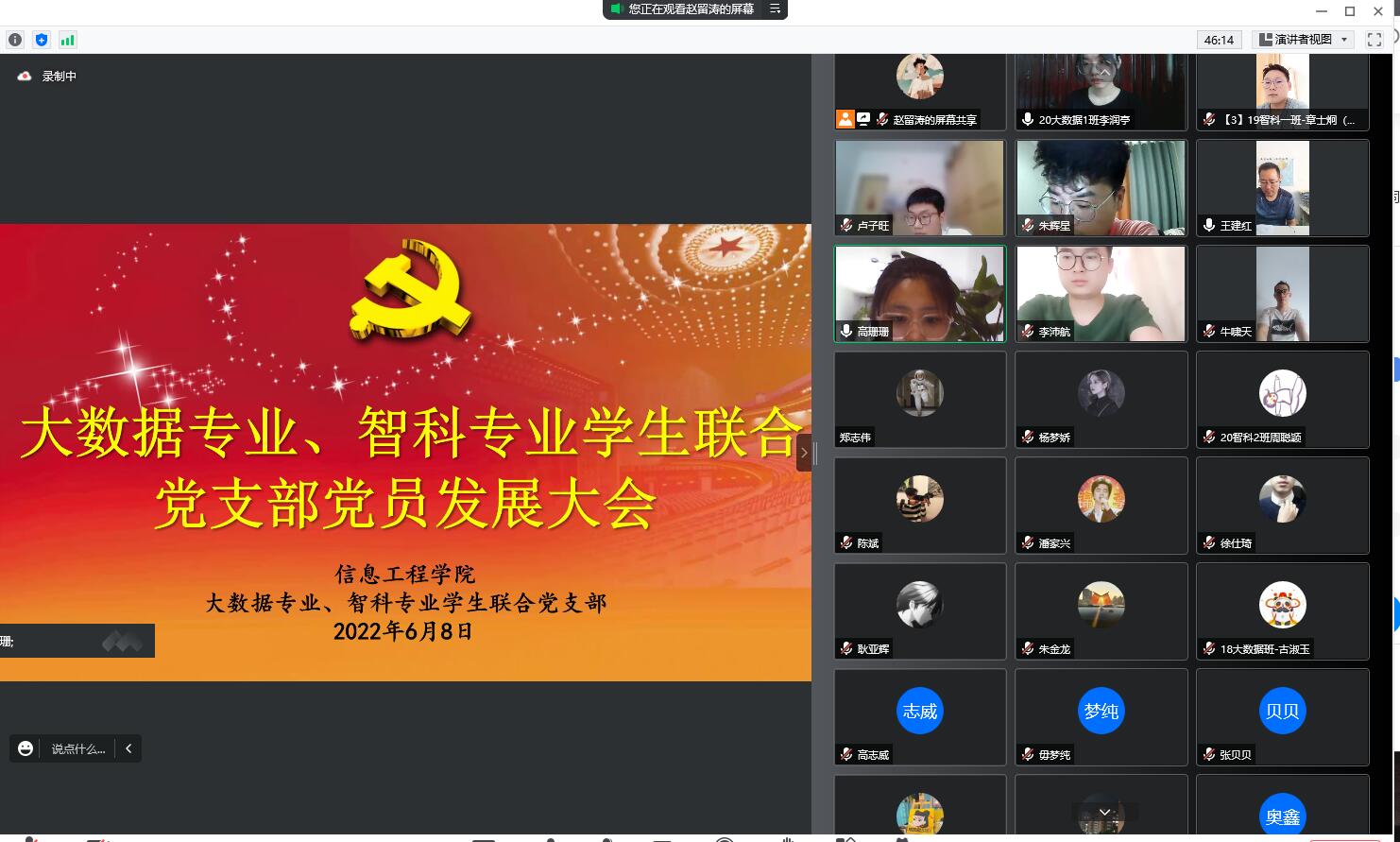 2022年6月8日,beat365大数据专业、智科专业员工联合党支部召开党员发展大会,大会的主要议题是对史新江等12名发展对象的讨论和表决。本次会议采用视频会议形式进行,支部正式党员、预备党员和部分发展对象出席本次会议,会议由支部书记王建红同志主持。