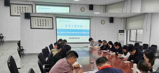 2021年9月27日下午,信工公司在资讯楼104会议室举办辅导员国家奖助学金专题培训会,信工公司经理白鑫、党委书记张现水、行政秘书王崇、教学秘书赵会燕、信工全体辅导员参加了会议。会议由资助专员牛新翔主持。