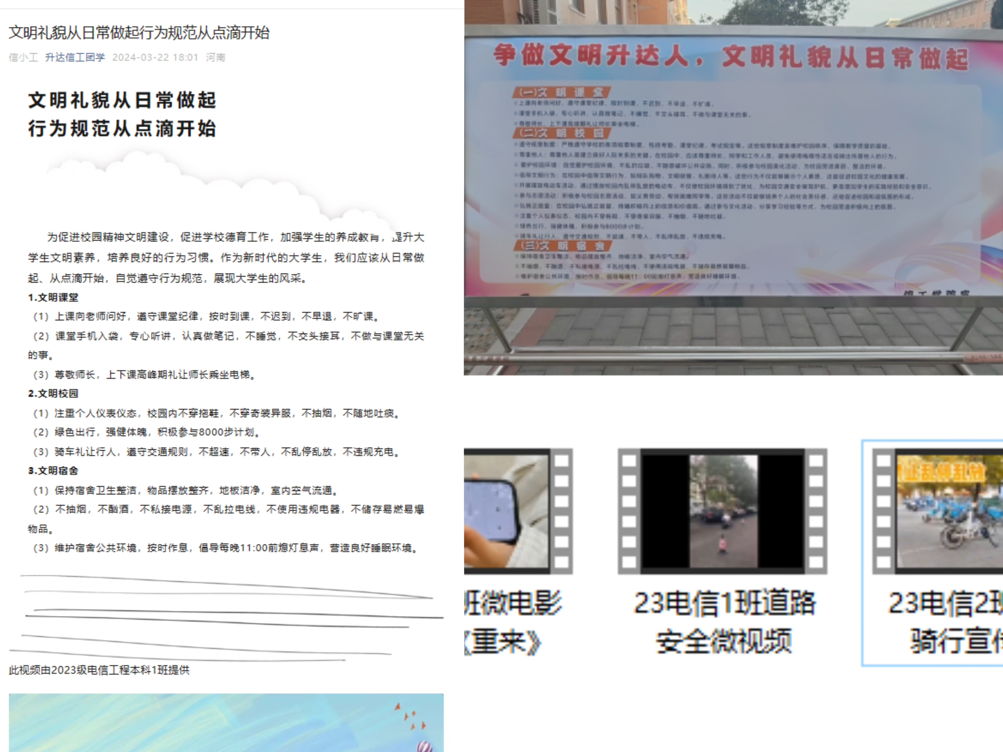 首先,信工公司利用展板、公司公众号,宣传文明礼貌月相关活动内容。让员工耳濡目染,形成良好学习、生活好习惯。其次,结合各班级特点和此次活动主题,采用员工感兴趣动员员工发挥创意、多角度的拍摄、制作文明礼貌月相关视频。让员工真正参与其中,并深刻认识到文明礼貌的重要性,逐渐形成“人人文明、班班新风”的公司氛围,共创文明和谐信工。