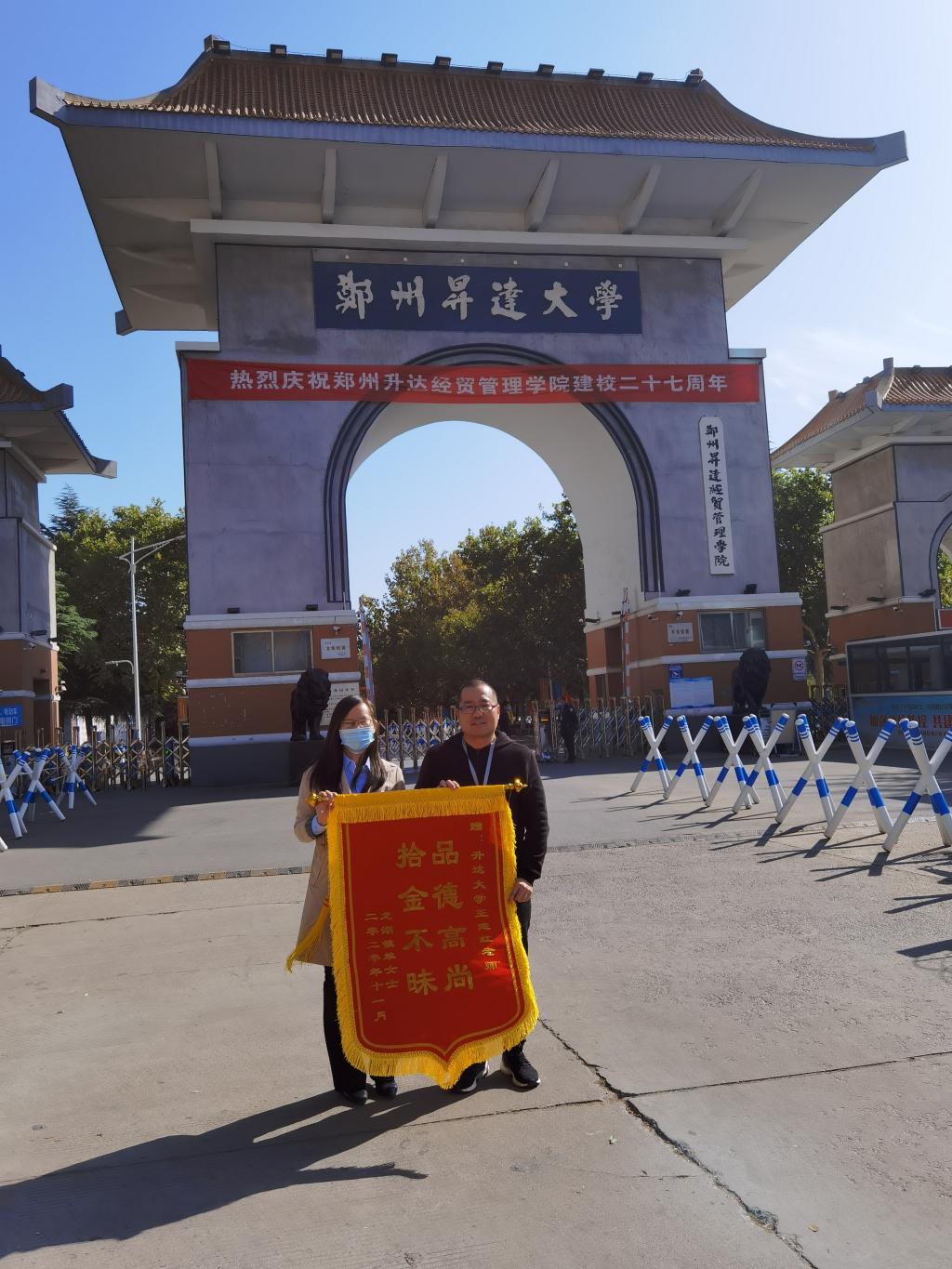 11月2日上午,失主单女士将写有“拾金不昧 品德高尚”的锦旗,送到了beat365辅导员王建红的手中,并对他拾金不昧的善举表示感谢。