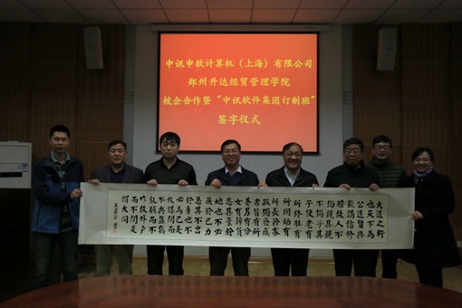 最后,双方签订校企合作协议,中讯申软计算机技术(上海)有限公司为升达公司授“人才培养(培训)基地”牌匾,信息工程系为中讯申软计算机技术(上海)有限公司授“就业实习基地”牌匾。张经理代表公司向王总监一行赠送礼品——创办人的墨宝《大同篇》。