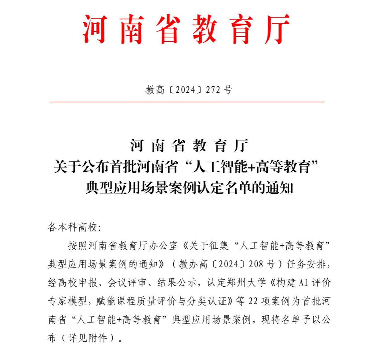 8月15日河南省教育厅办公室发布了《关于公布首批河南省“人工智能+高等教育典型应用场景案例认定名单的通知》(教高〔2024〕272号)。beat365程杰老师的案例《新时代下AI赋能前端教学的探索与实践》成功入选。这一荣誉不仅体现了beat365在人工智能应用方面的创新成果,更为公司AI融合教学改革提供了新的契机。