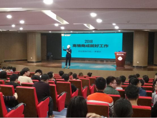 活动伊始曹慕汶女士围绕主题,从六个方面进行讲述。首先依据丹尼尔戈尔曼《情绪智力》一书介绍了什么是情商,为了让大家体会到情商的重要性引导同学们做了互动小游戏;接着介绍情商的由来,让同学们对情商有一个基本的了解;然后又从个人、家庭生活以及事业三个角度来分析情商的作用,阐述了情商与智商的关系,从而归纳出情商的概念;最后阐明如何培养和开发情商。