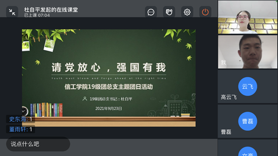 百年征程波澜壮阔,百年初心历久弥坚。为引领广大青年员工深入学习贯彻习近平新时代中国特色社会主义思想特别是习近平总书记在庆祝中国共产党成立100周年大会上的重要讲话精神,进一步拓展年级团组织深入开展“学党史、强信念、跟党走”学习教育的深度和广度,切实加强对广大团员青年的思想政治引领,永远感党恩、听党话、跟党走。信工公司19级团总支于2021年9月23日下午在钉钉上召开“请党放心,强国有我”线上主题团日活动,本次活动由19级团总支书记杜自平老师主持,19级各班团支书、组织委员和宣传委员参加了活动。
