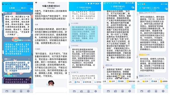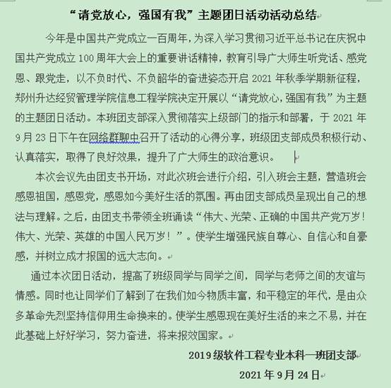 随后,与会团员青年认真学习领会了习近平总书记的重要讲话精神,各班团支书分别汇报了本班团支部开展主题团日活动的情况,围绕践行“请党放心,强国有我”的庄严承诺,开展学习讨论。