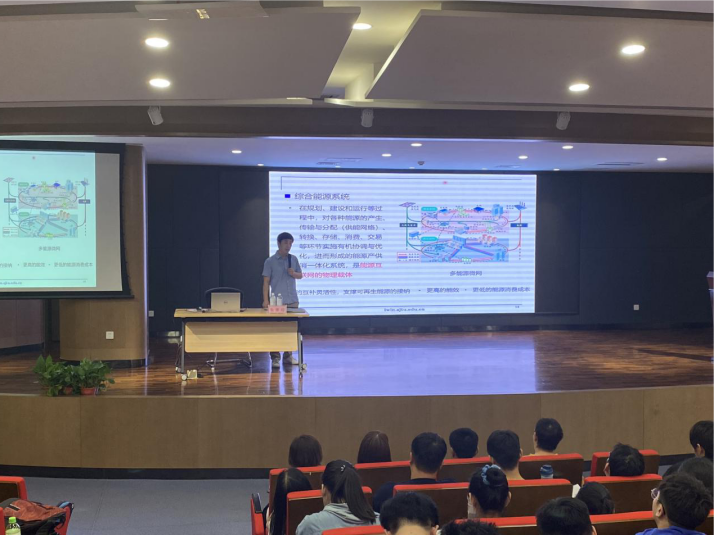 报告会上朱教授首先讲述了当前能源短缺、资源紧张的背景,为实现能源转型,国家提出”碳达峰”和“碳中和”的目标,因此建立综合能源系统,形成能源产供销一体化系统迫在眉睫。朱教授以互联网为类比对象,详细分析了能源互联网的结构及功能,比如建立能源枢纽,实现微网能源交易等。在报告中朱教授以小镇故事、囚徒困境等内容深入浅出的让同学们了解博弈论相关知识,让复杂的数学模型变得生动有趣。最后对于能源系统能源管理中存在的问题,朱教授通过结合当今学术热点人工智能、强化学习等相关领域对能源调度进行仿真优化,实现能源产生、传输、消费等环节有机协调。