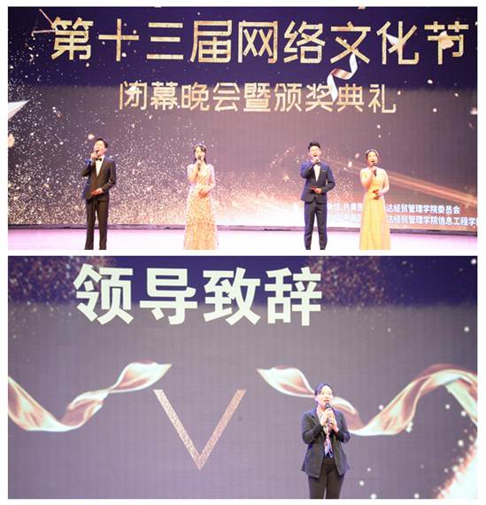 一支精彩火辣的舞蹈拉开了晚会帷幕,激发了全场的气氛。随后,信工beat365党总支王新平书记致辞。王新平书记首先对精心组织、大力支持以及积极参与第十三届网络文化节的全体师生表示感谢,向获奖的同学表示热烈的祝贺,同时,她指出本次网络文化节主题鲜明,内容丰富、不仅丰富了校园文化生活,更增强了同学们的创新能力和专业实践能力;王书记希望同学们能够以网络文化节为契机,积极学习网络技能,不断提升文明素养,弘扬传播正能量。
