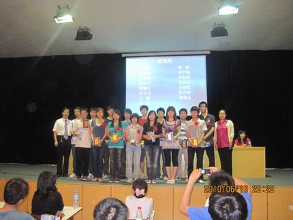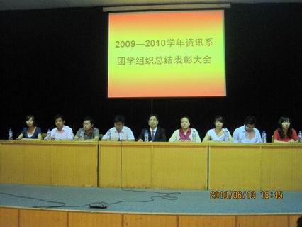 6月10日晚6:40,2009-2010学年资讯系团学组织总结表彰大会在龙湖报告厅隆重召开。资讯系党总支魏民书记,党总支王新平副书记,团委书记陈刚老师,系党总支委员、辅导员张娟老师,团委常务副书记曹丹丹老师,06级年级团总支书记李磊老师,07级年级团总支书记袁保华老师,08级年级团总支书记苗淑娟老师,09级年级团总支书记袁奉亚老师,辅导员丁玥老师、刘叶青老师,团学全体人员,各年级团总支全体干部,各班班长、团支书共计270余人参加了本次大会。