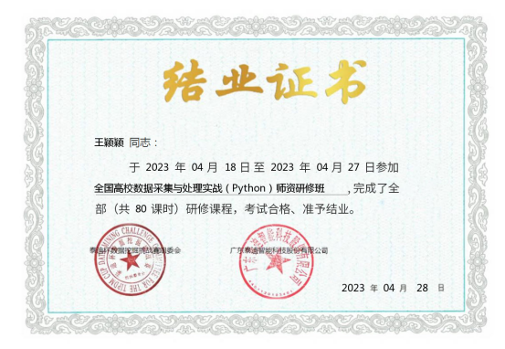 为加快建设大数据相关专业教师队伍,公司特派遣大数据教研室王颖颖老师参加2023年4月18日—4月27日由泰迪杯数据挖掘挑战赛组委会主办的全国高校大数据与人工智能骨干团队研修班。