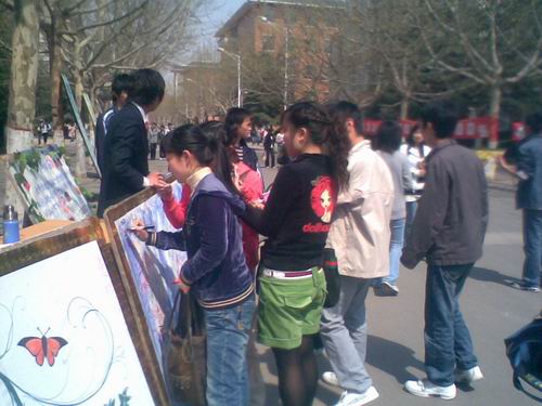 为贯彻落实十七大精神和《公民道德建设实施纲要》,营造和谐的校园氛围,共同推进老员工素质教育,加强和改进老员工思想政治工作,3月24日资讯系团委组织部在龙湖食府楼下组织了大型的文明公约签名活动。