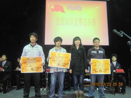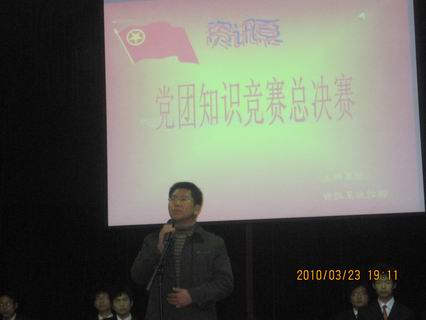 3月23日晚7点党团知识竞赛决赛在龙湖报告厅隆重举行,系行政秘书兼团委书记陈刚老师,团委副书记曹丹丹老师,08级年级团总支书记苗淑娟老师和系团委员工会团委副书记吕亚楠,副主席吴飞飞、靳鹏昌、徐志宁,团委书记助理宋权通以及院MMD社团社长和各系党团知识竞赛负责人出席了本次决赛。