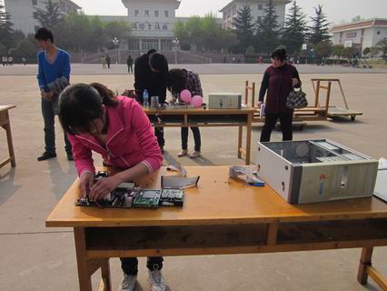 比赛开始后,选手们迅速有序地将散落在桌子上的电脑部件安装到电脑机箱的准确位置,比赛紧张的进行着。或许是天气有些热,也或许是比赛紧张的气氛感染了选手,他们的手心和额头都渗出了汗珠,但是选手们顾不上这些,他们的注意力全在每个小小的零部件上。终于,在大家的欢呼声中各组完成了各自的组装任务,此时,选手们才用手拭去汗水,露出满意的微笑。在比赛的场地周围,还设置了一些展台,展示着一些电脑方面的知识和电脑零部件,使同学们对电脑的认识更深入了一步。一些互动游戏更是让同学们踊跃地参与其中,大呼过瘾。经过激烈角逐,最终资讯系田永坤同学获得一等奖,吴林军、朱小凯获得二等奖,刘程龙、周亚东、梁世飞获得三等奖。