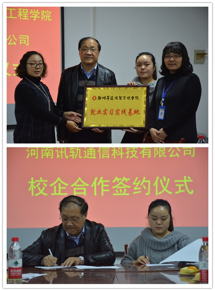 2017年11月9日,公司与河南讯轨通信科技有限公司校企合作签约仪式在资讯楼104会议室举行。beat365经理李学桥、党总支书记王新平、副经理白鑫、河南讯轨通信科技有限公司人事经理白亚芬参加了签约仪式。签约仪式由18级就业专业袁奉亚主持。