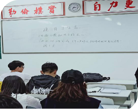 18级物联网1班每周的周日至周四18:30-20:30进行晚自习,学艺股长于18:25提前进班做好签到准备并且在黑板上写下今日老师所留下的作业供同学自习期间自主完成。