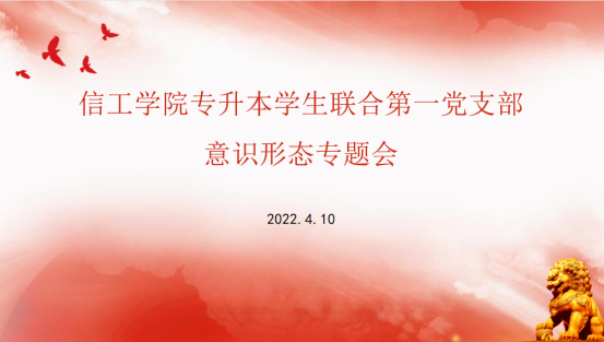 为进一步激发党支部宣传工作活力,加强和改进意识形态工作,推动宣传工作制度化,规范化,科学化。4月10日下午4点,信工公司专升本员工联合第一党支部组织开展意识形态专题学习线上会议,支部全体党员、预备党员参加会议,会议由专升本员工联合第一党支部书记宁珂主持。